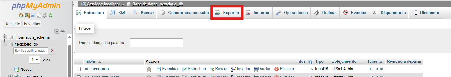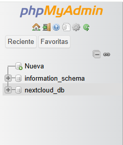 - En el panel izquierdo, seleccionamos la base de datos de nextcloud