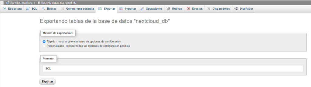 - En el método de exportación, elegimos rápido para exportar la base de datos completa de forma rápida