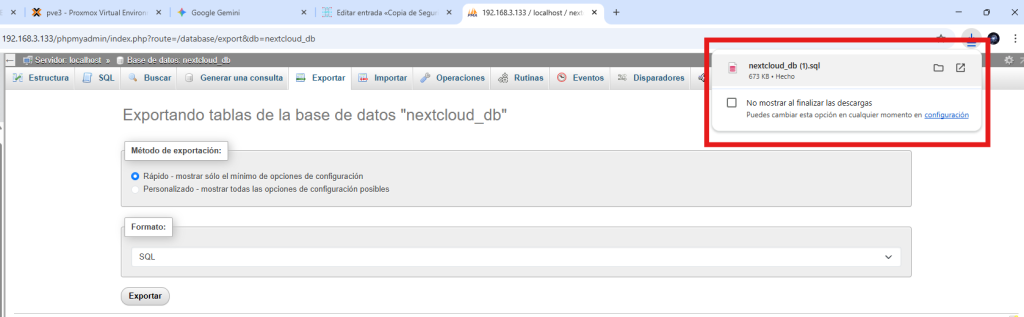 - Hacemos clic en exportar para descargar el archivo de copia de seguridad en nuestra computadora