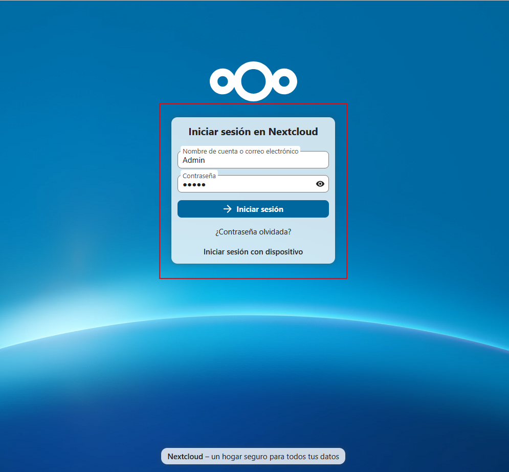 Primero, debes iniciar sesión en Nextcloud del sitio web atravez de URL o IP como en el siguiente ejemplohttp://nextcloud.web-virtual.com/nextcloud o http://192.168.3.133/nextcloud con tu cuenta de administrador. Esta es la cuenta que creaste durante la instalación.