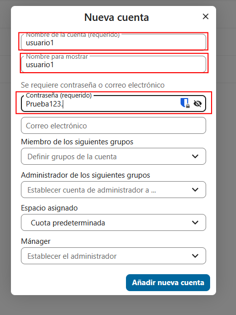 - Nombre de la cuenta: Elige un nombre de usuario único que sera con el iniciaras sesión en próximos accesos que hagas (por ejemplo, usuario1).