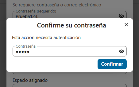- Contraseña: Establece una contraseña segura en este ejemplo vamos a usar como contraseña “Prueba123.“. Nextcloud te mostrará la fuerza de la contraseña.