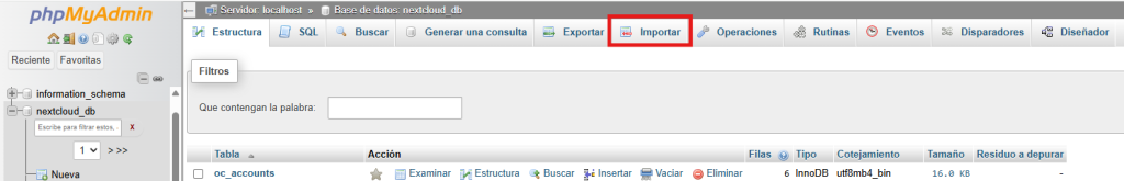 una vez que estemos en la base de datos, hacemos clic en la pestaña importar en la parte superior