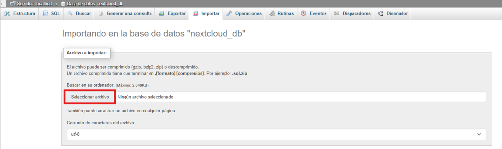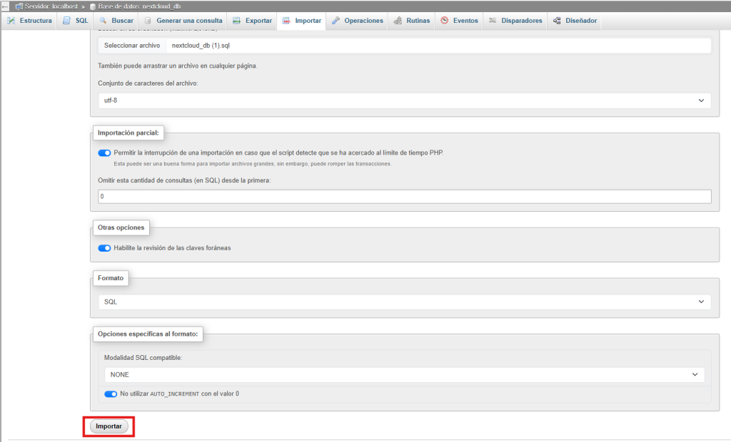 (en la mayoría de los casos, las opciones predeterminadas son suficientes. sin embargo, si tu archivo e muy grande, es posible es posible que tengas que ajustar el tamaño máximo de importación en la configuración de PHP)
